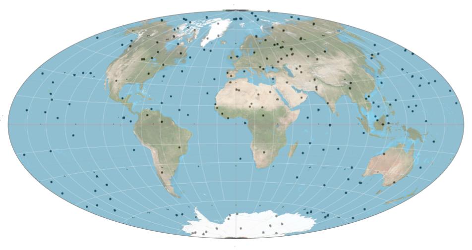 The 212 GPS Quasars. Astronomers know these as Extragalactic Radio Sources. They are the foundation for accurate GPS positioning. Quasar projection map fusion by Daniel Cummings, quasar locations courtesy NASA. A flattened version of the Quasar GPS map. The image above shows quasars plotted as Earth surface locations (as mapped on the celestial sphere). This is a map of quasars and their locations on the celestial sphere. If you want to imagine them in 3D, you can imagine straight lines or threads connected from every part of Earth. These lines poke straight out like 212 dry spaghetti strands stuck into a foam ball. Each strand points at an individual quasar.