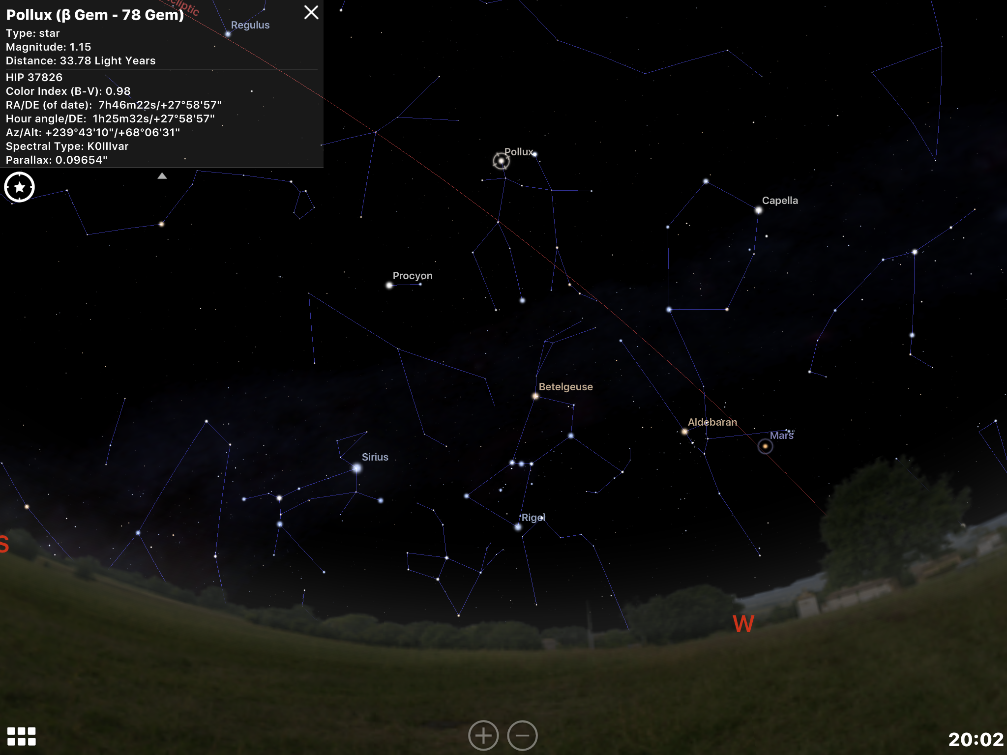 Pollux is part of the constellation Gemini (The Twins) and is visible at night throughout the northern hemisphere Winter and Spring. It is easy to find because it is part of the Winter Hexagon and it stays right next to its equally bright twin, Castor. Pollux’s exoplanet is named “Thestias” after Pollux and Castor’s grandfather.