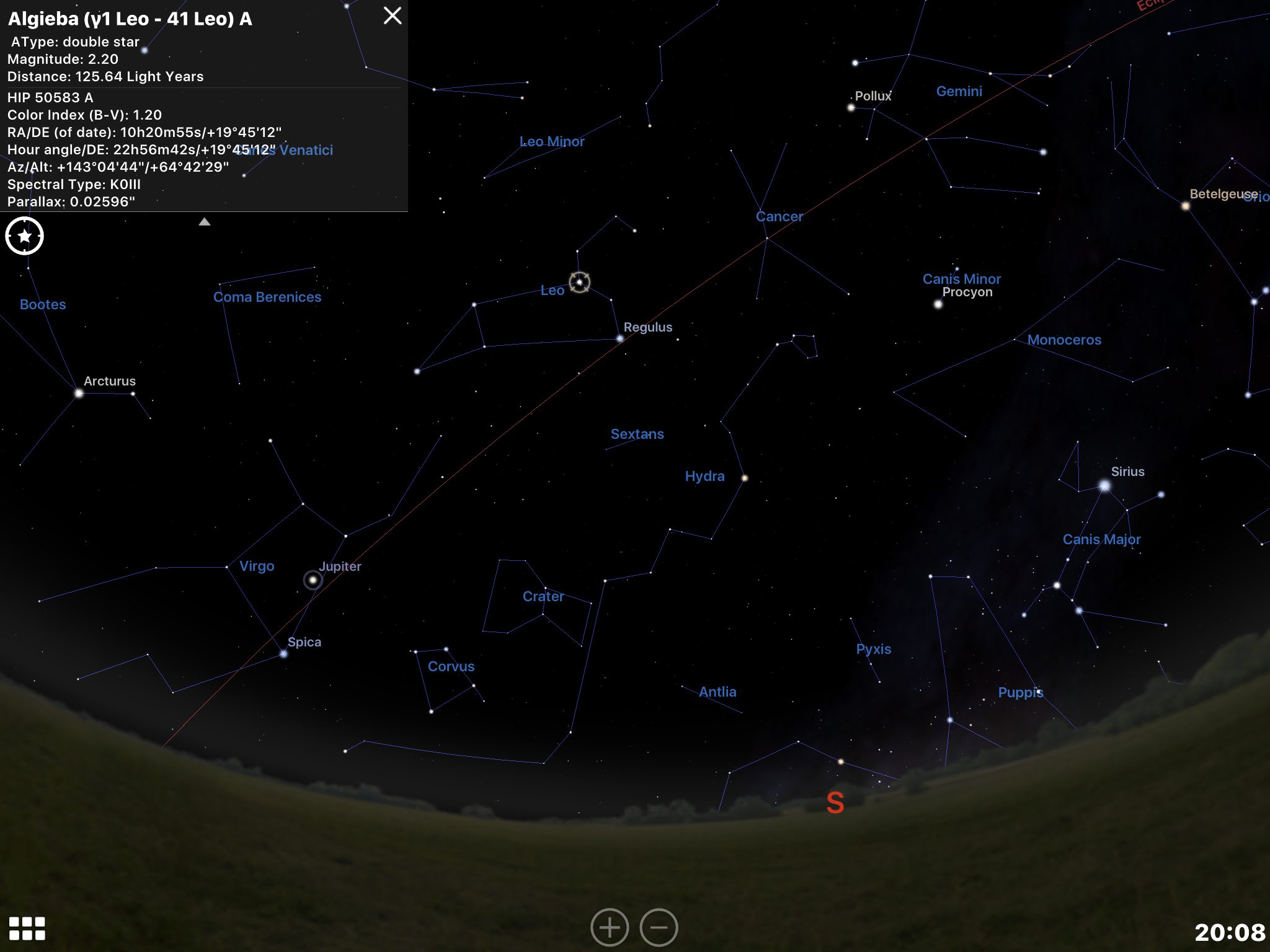 Algeiba is the star that is the neck (or mane) of the constellation Leo - the Lion - just to the north of the bright star Regulus. It forms the middle part of the “sickle” asterism that sits in the constellation Leo. This star is visible through the Spring and Summer.
