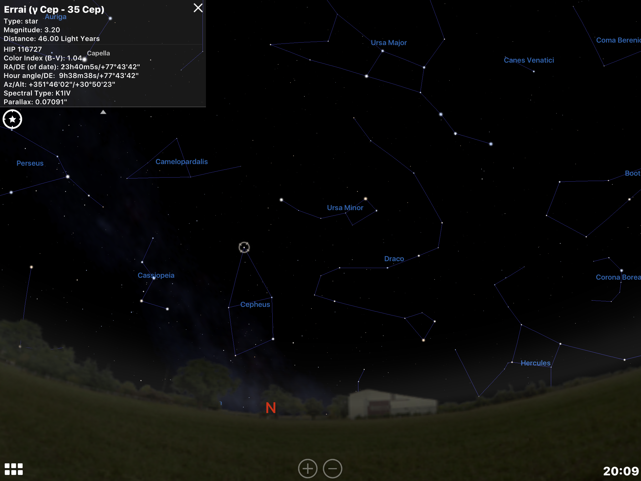 Errai looks like it might be the pointy tip of King Cepheus’ hat, but it is actually the king’s knee. It is a circumpolar star that is visible year-round. This star is easier to see in the Summer and Fall seasons. “Tadmor” is the name of Errai’s exoplanet - named for the Syrian city of Palmyra. Now we start to get into the stars that do not have historical names, but they are still bright enough to see.