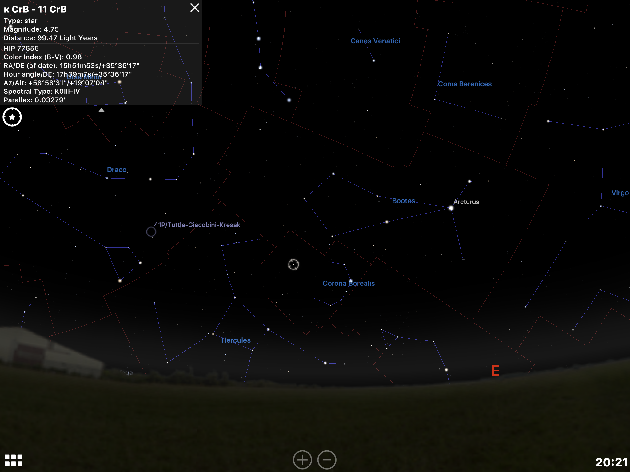 The constellation Corona Borealis is a curve of stars next to Boötes and the bright star Arcturus. Alphekka is the brightest of the group and just nearby is 11 Corona Borealis.
