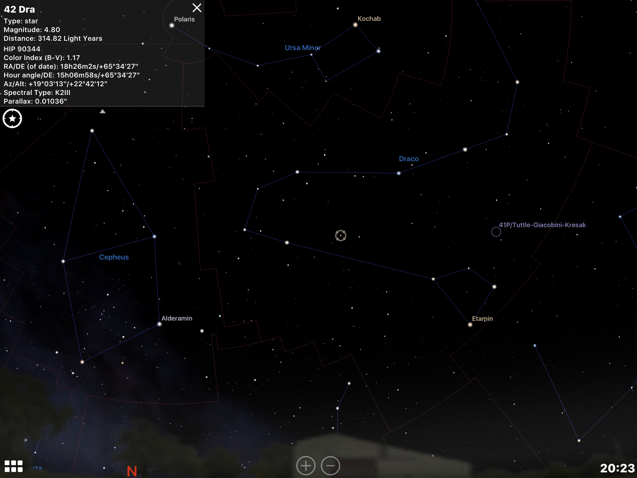 42 Draco (named Fafnir after a Norse myth) is between the fantastically named stars Altais and Grumium. Draco is the “dragon” that circles the north star every day. The exoplanet that orbits Fafnir is named “Orbitar.”