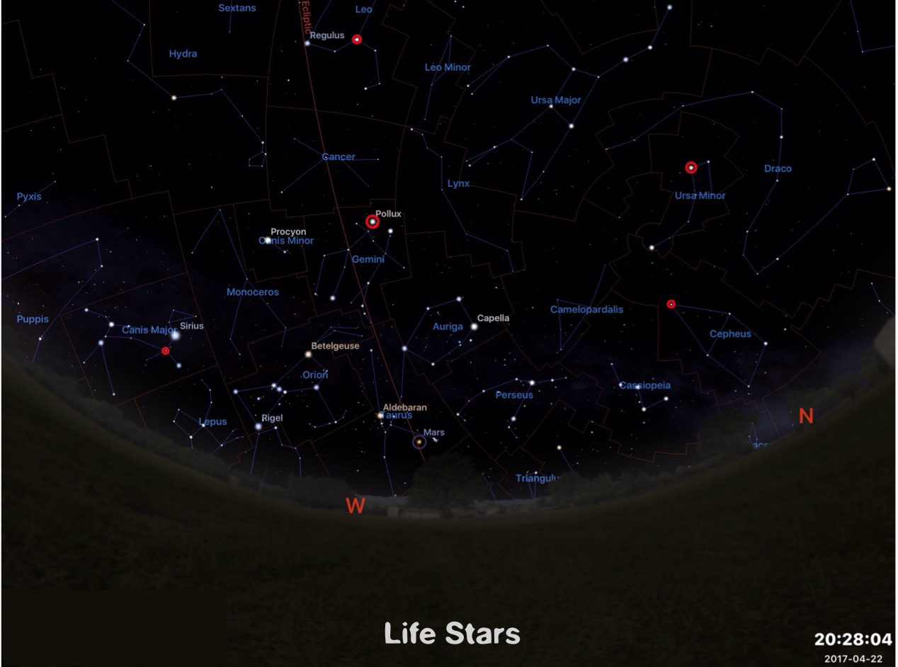 The 5 brightest Life Stars - Pollux, Kochab, Algeiba, Errai, 7 CanisMajor Note: All images in this listing are generated using Stellarium and show what the sky looks like approximately 8pm on Earth Day April 22nd, 2017 in the Northern Hemisphere.