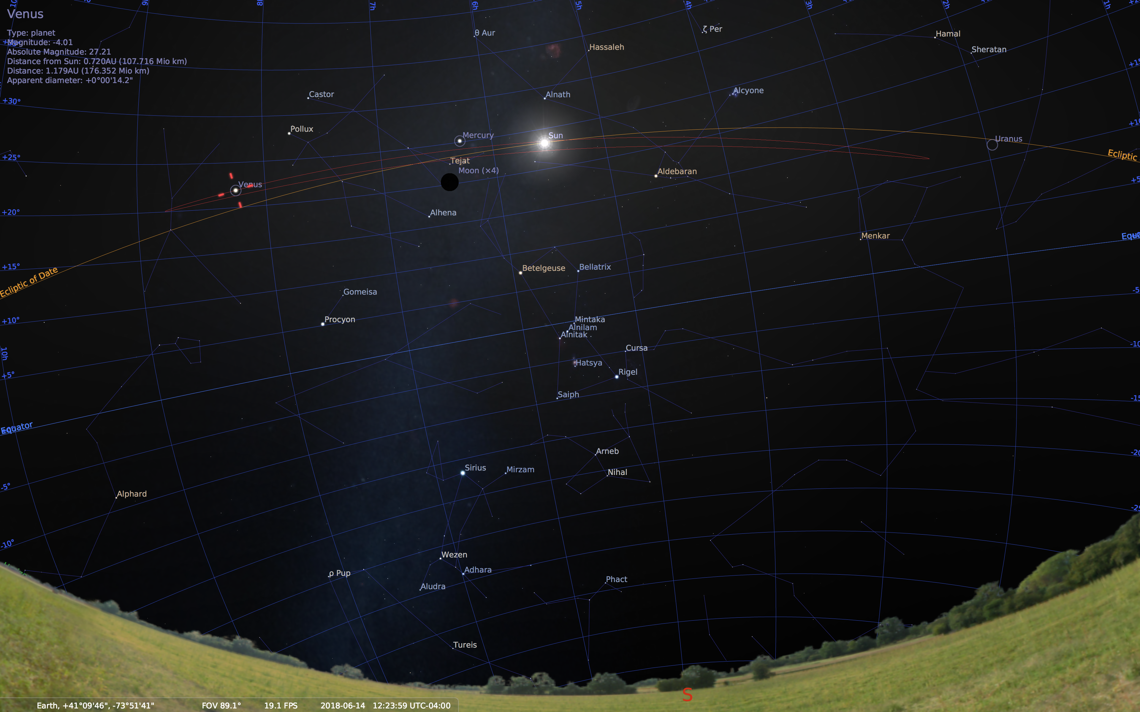 The orbit of Venus seen against the background of springtime evening stars. Stellarium view. Venus’s orbit spans 7 hours of the sky. To visualize that in the night sky (in springtime) Venus’s orbit spans from Regulus to the Pleiades (the seven sisters).