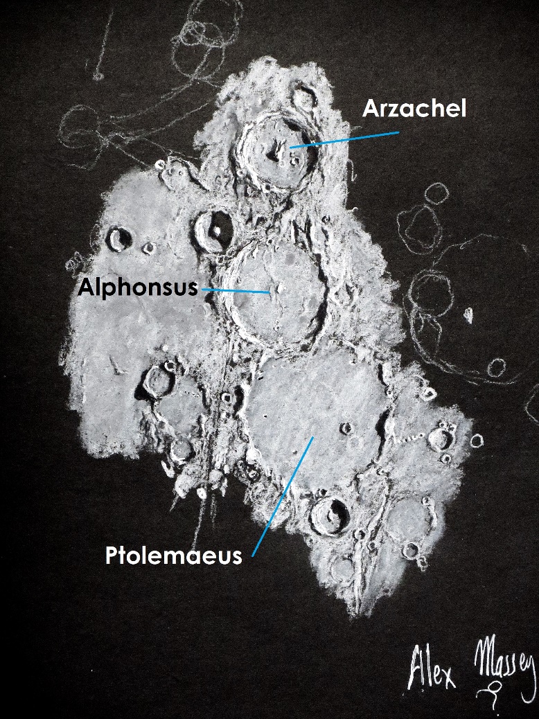 Live View Sketch of Moon craters Azrachel, Alphonsus, and Ptolemaeus by Alex Massey