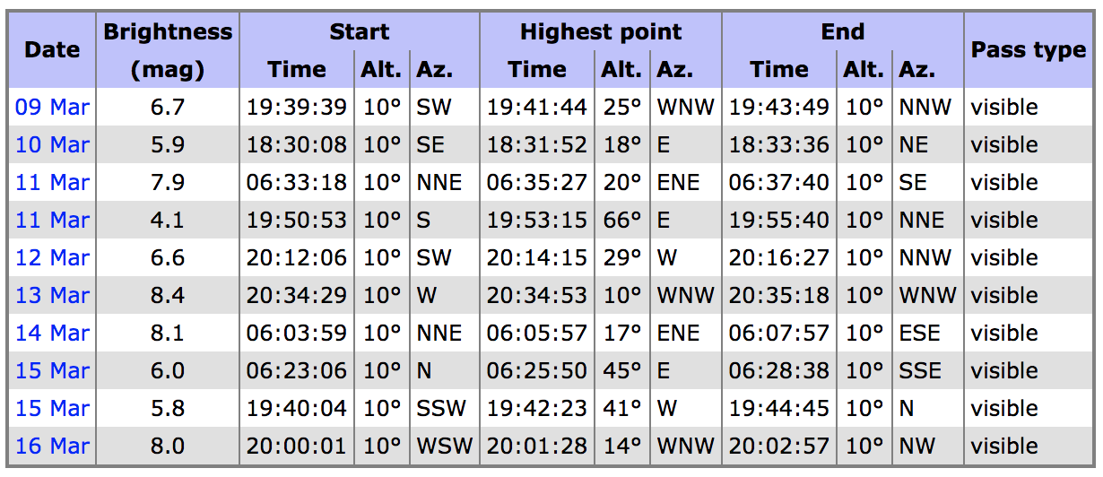 Table of predictions for the New York metropolitan area Humanity Star visibility and brightness. I would love to hear if you were able to use these directions to find and see the Humanity Star in your area! Clear Skies. Happy Humanity Star satellite hunting with Stellarium.