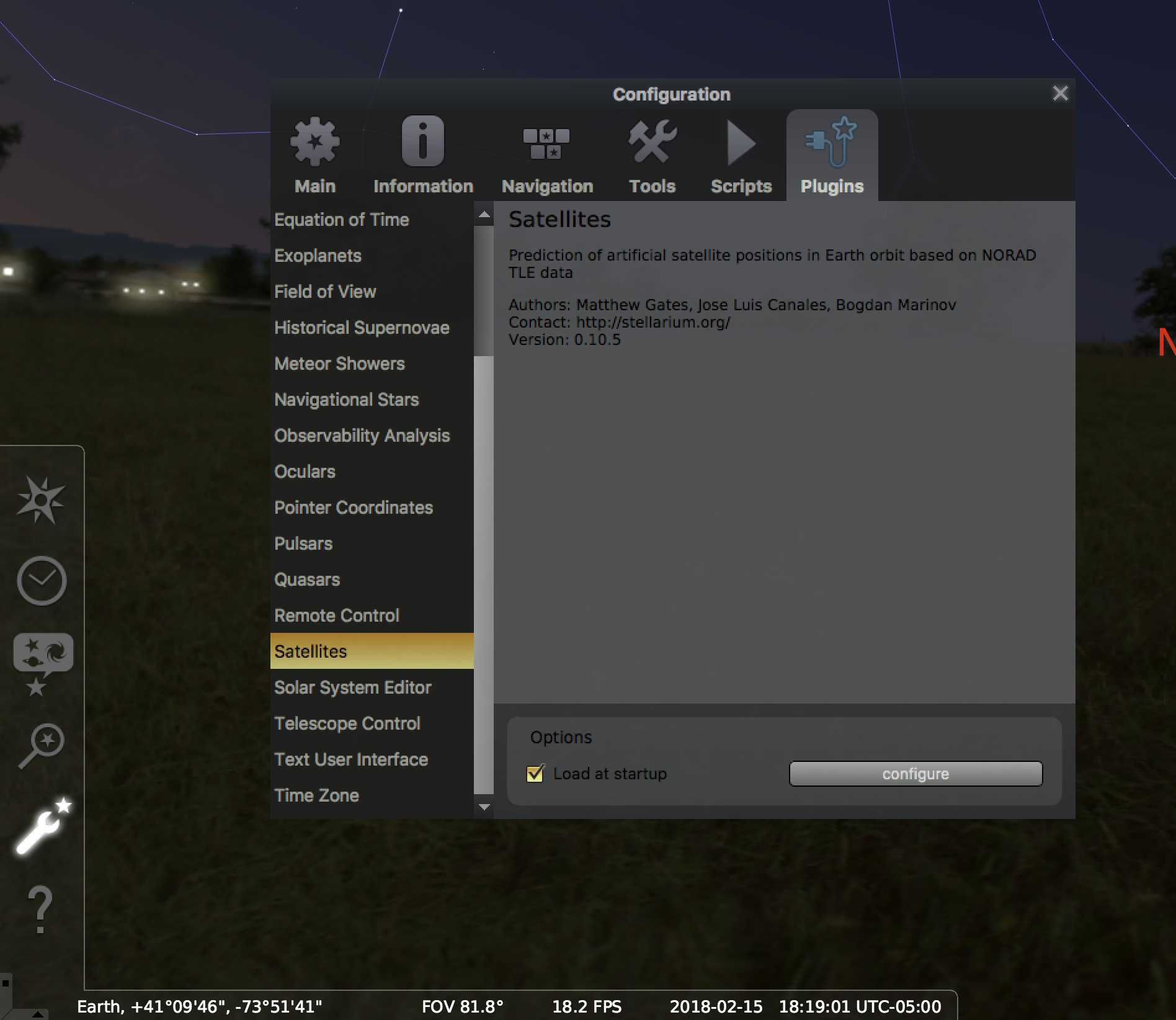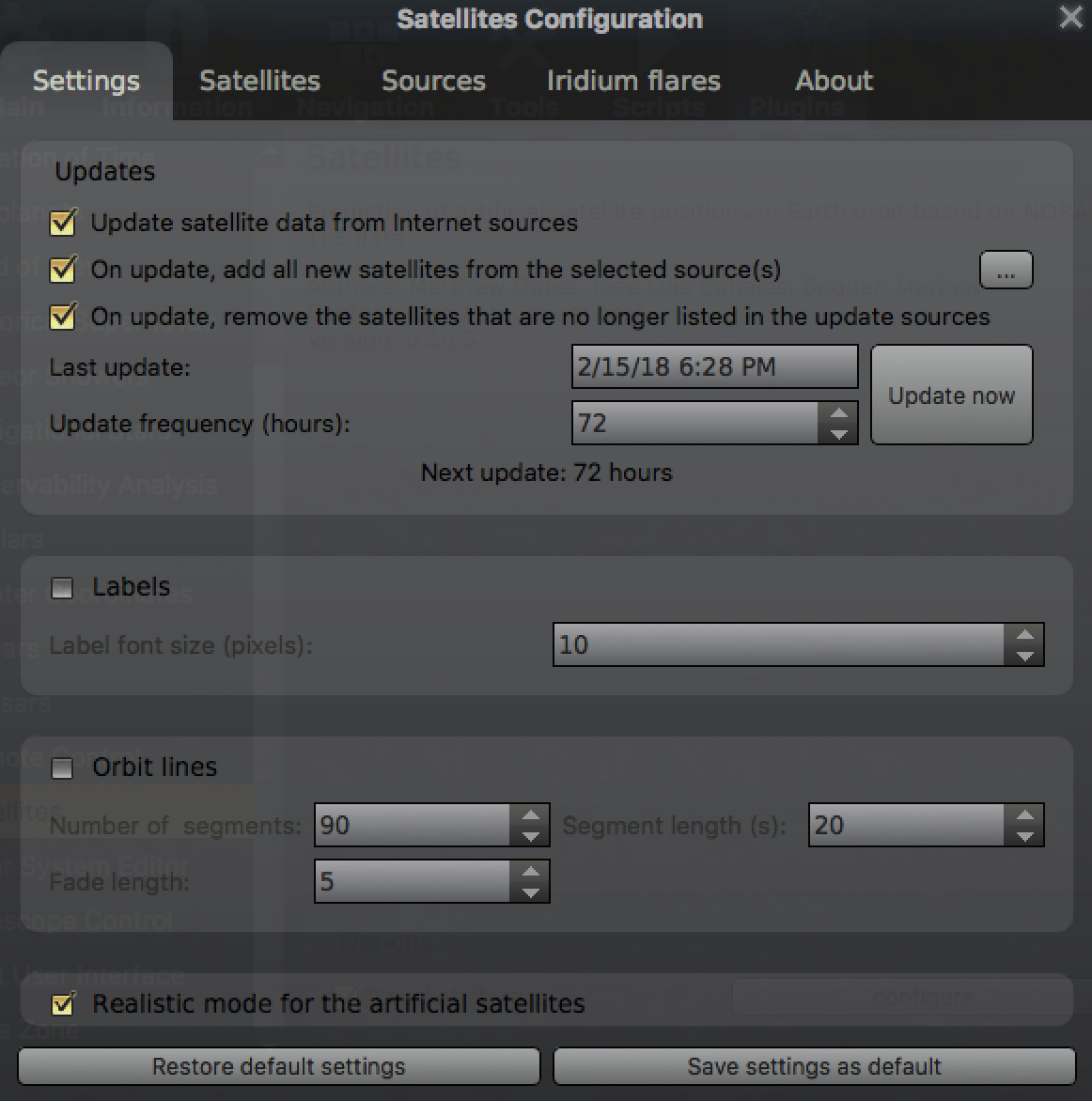 Stellarium configuration window showing the satellites plugin.