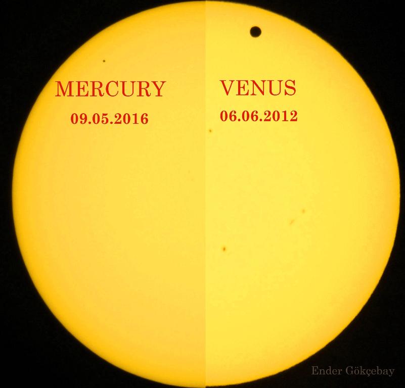 The two inner planets - Mercury and Venus - will sometimes cross the face of the Sun (astronomers call this a “transit”). They seem very small against the disk of the Sun. Here is a side-by-side comparison of the two most recent transits (photo composite by Ender Gökçebay).